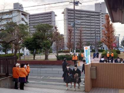 本日のあいさつ運動は、先生たちと生活委員会の皆さんに加えて、城東区の保護司会の方々による、社会を明るくする運動も同時に行われています。
