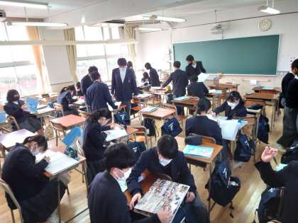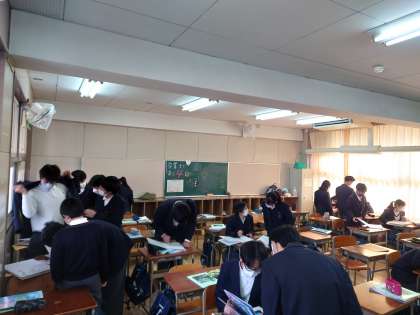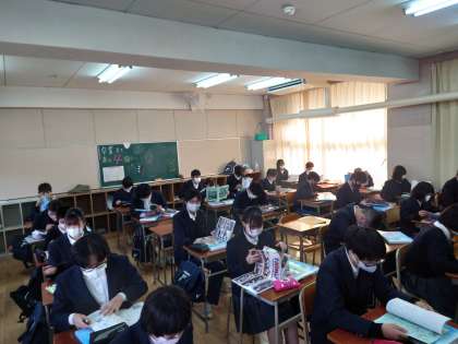そこで、本日1限目の時間を利用して卒業アルバムと卒業文集が3年生に配られました。1年生の時の写真や楽しかった思い出の写真を見て、歓声があがっています。その後、卒業アルバムの後ろにある白紙のページに友だちからサインをしてもらうなど、楽しいひと時を過ごしています。