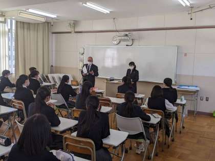 本日2年生は、5・6限目を使って「高校の先生方による体験講座」として、様々な高等学校の先生をお招きして体験授業を行っています。4月には、進路選択をする中学校最後の1年をむかえることになります。この時期から進路選択に向けた取り組みをすることで、来年度への準備にもなります。
