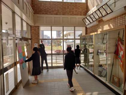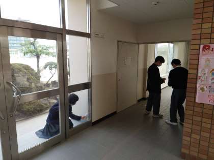 2年生の大清掃で来てくれているメンバーが、正門付近の掃き掃除と、玄関ホールの窓や扉、鏡までキレイに拭き掃除をしてくれています。