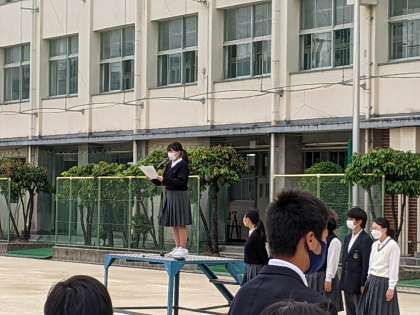 続いて生徒会の代表より、SNSを通じたコミュニケーションでいじめが発生していることやそれに対してSNSをどんなふうに利用するべきか、どんな状況でいじめがおこってしまうか、いじめを発見したときにどんな行動をとるべきかについて紹介し、全校生徒にいじめをなくすための行動を呼びかけていました。