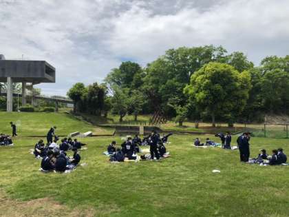 到着後、健康観察を行なってから学級写真を撮り、昼食を食べました。
