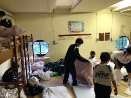 先ほど、各クラスごとに分かれての入浴や食事、部屋の整備などが終わりました。慌ただしい中ですが、次のことを考えながら動くよう意識して過ごしています。