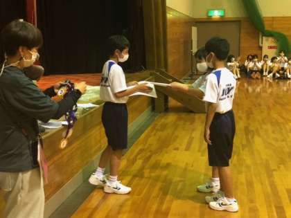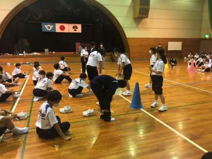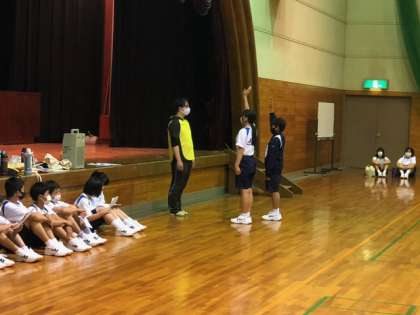 施設内大ホールでの夜レクの様子です。クラスで力を合わせて、色々な競技に挑みました。