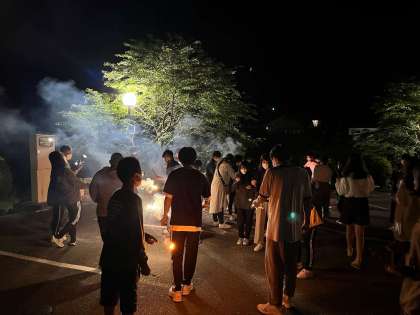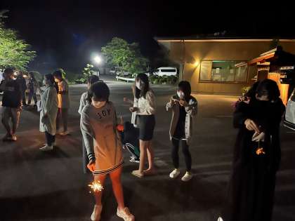 晩ごはんが終了し、夜のレクリエーションをしています。星空を見上げながらの花火です。夜空には北斗七星が輝いています。