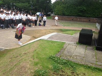 午前9時、原子爆弾落下中心地碑を訪れ、平和を祈念してセレモニーを執り行いました。67期生一同、折鶴を奉納し、次の時代の担い手として二度と悲惨な戦争を繰り返さないことを心に誓い、平和宣言を行いました。