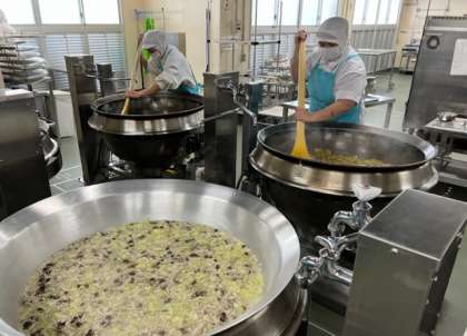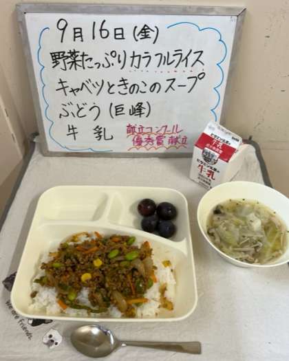 9月16日(金)今日の給食の献立は、「野菜たっぷりカラフルライス キャベツときのこのスープ ぶどう(巨峰)牛乳」です。