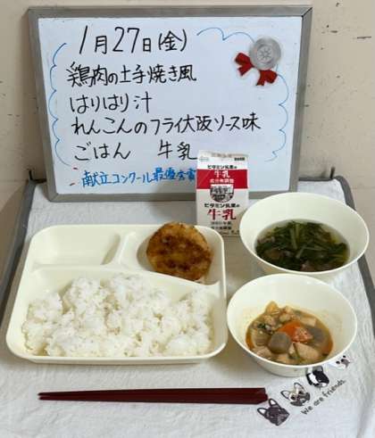 1月27日(金)今日の給食の献立は、「鶏肉のどて焼き風 はりはり汁 れんこんのフライ大阪ソース味 ご飯 牛乳」です。