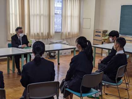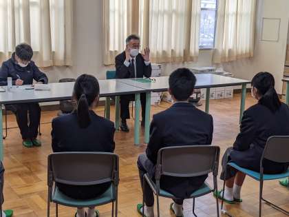 3年生が入学試験などに向けた面接練習を行っています。30秒〜1分以内で自己紹介から志望動機、尊敬する人、自分の長所などを発表した後、中野校長が入退室の仕方や座り方など面接時の心構えなどを指導しました。