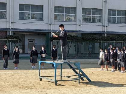朝の全校集会終了後、在校生代表と卒業生代表がそれぞれに別れの挨拶を行いました。