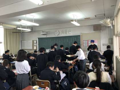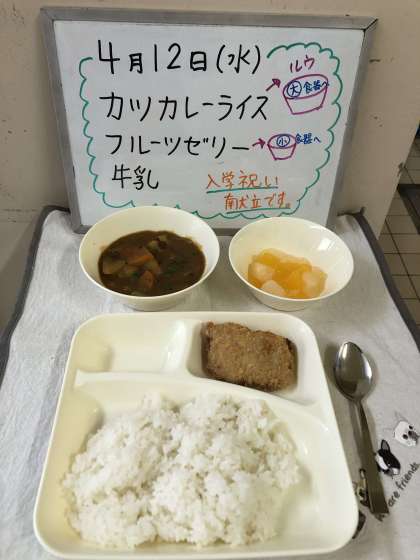 4月12日(水)今日の給食の献立は、『カツカレーライス、フルーツゼリー、牛乳』でした。新入生の入学をお祝いする気持ちが込められています。