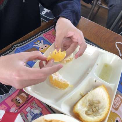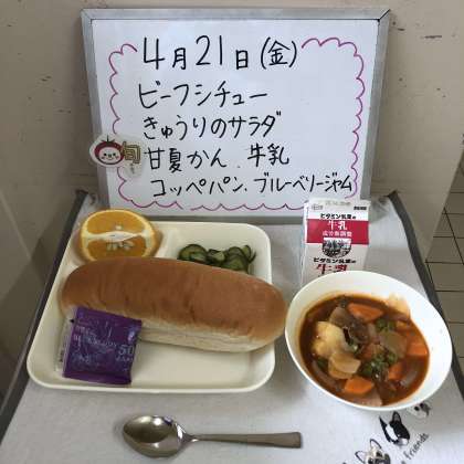 4月21日(金)今日の給食の献立は、『ビーフシチュー、きゅうりのサラダ、甘夏かん、コッペパン、ブルーベリージャム、牛乳』です。甘夏かんは、「川野ナツダイダイ」という品種のかんきつ類です。夏みかんから偶然うまれました。夏みかんより酸味が少なく、食べやすいのが特徴です。上手に皮をむいて食べていました。