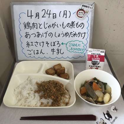 4月24日(月)今日の給食の献立は、『鶏肉とじゃがいもの煮もの、あつあげのしょうゆだれかけ、紅さけそぼろ、ごはん、牛乳』です。