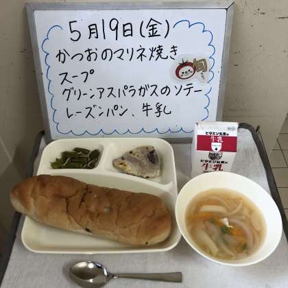 5月19日(金)今日の給食の献立は、『かつおのマリネ焼き、スープ、グリーンアスパラガスのソテー、レーズンパン、牛乳』でした。