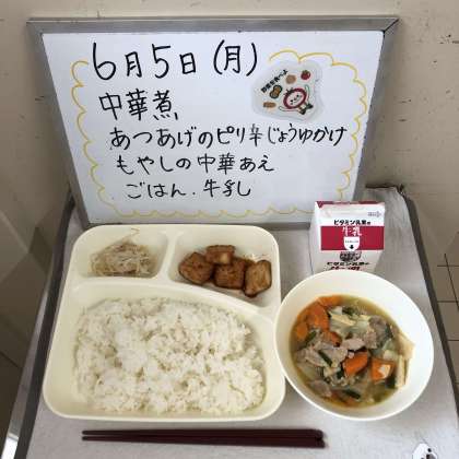 今日の給食の献立は、『中華煮、あつあげのピリ辛じょうゆかけ、もやしの中華あえ、ごはん、牛乳』でした。