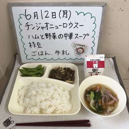 今日の給食の献立は、『チンジャオニューロウスー、ハムと野菜の中華スープ、枝豆、ごはん、牛乳』でした。