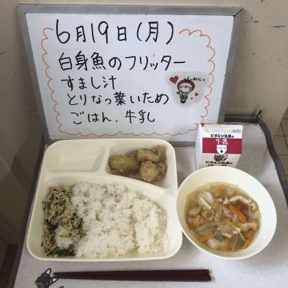 今日の給食の献立は、『白身魚フリッター、すまし汁、とりなっ葉いため、ごはん、牛乳』でした。