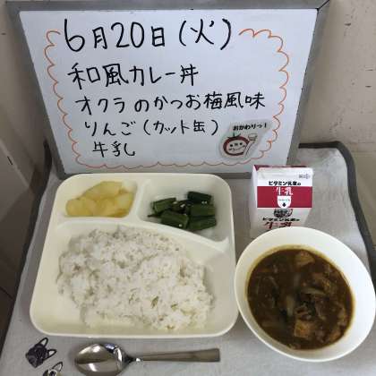 今日の給食の献立は、『和風カレー丼、オクラのかつお梅風味、りんご(カット缶)、牛乳』でした。