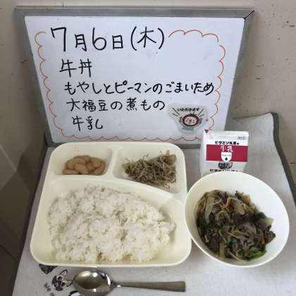 今日の給食の献立は、『牛丼、もやしとピーマンのごまいため、大福豆の煮もの、牛乳』でした。