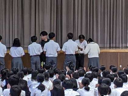 始業式終了後は全校集会で陸上競技部、水泳部の賞状伝達を行いました。