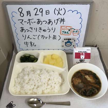 今日の給食の献立は、『マーボーあつあげ丼、あっさりきゅうり、りんこ(カット缶)、牛乳』でした。