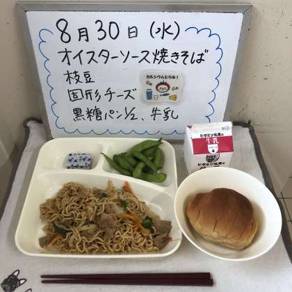 今日の給食の献立は、『オイスターソース焼きそば、枝豆、固形チーズ、黒糖パン1/2、牛乳』でした。