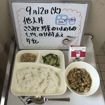 今日の給食の献立は、『他人丼、ささみと野菜のいためもの、もやしの甘酢あえ、牛乳』でした。