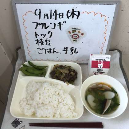 今日の給食の献立は、『プルコギ、トック、枝豆、ごはん、牛乳』でした。