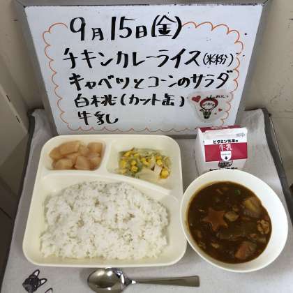 今日の給食の献立は、『チキンカレーライス(米粉)、キャベツとコーンのサラダ、白桃(カット缶)、牛乳』でした。
