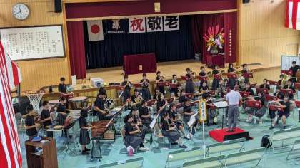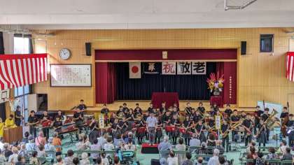 鴫野小学校体育館にて行われた敬老会で、本校吹奏楽部が演奏をさせていただきました。