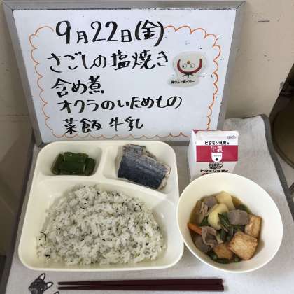 『さごしの塩焼き、含め煮、オクラのいためもの、菜飯、牛乳』でした。