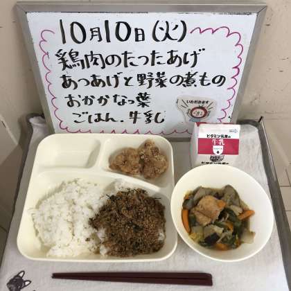 今日の給食の献立は、『鶏肉のたつたあげ、あつあげと野菜の煮もの、おかかなっ葉、ごはん、牛乳』でした。