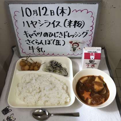 今日の給食の献立は、『ハヤシライス、キャベツのひじきドレッシング、さくらんぼ(缶)、牛乳』でした。