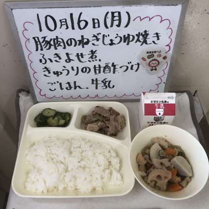 今日の給食の献立は、『豚肉のねぎじょうゆ焼き、ふきよせ煮、きゅうりの甘酢づけ、ごはん、牛乳』でした。