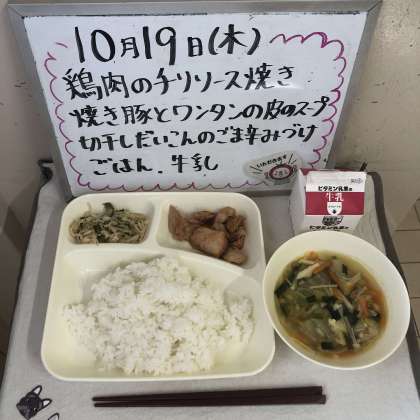 今日の給食の献立は、『鶏肉のチリソース焼き、焼き豚とワンタンの皮のスープ、切干しだいこんのごま辛みづけ、ごはん、牛乳』でした。