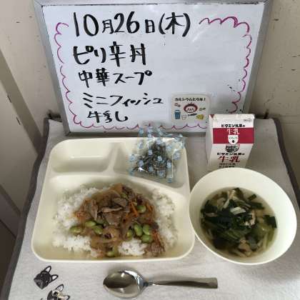 今日の給食の献立は、『ピリ辛丼、中華スープ、ミニフィッシュ、牛乳』でした。