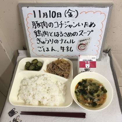 今日の給食の献立は、『豚肉のコチジャンいため、鶏肉とはるさめのスープ、きゅうりのナムル、ごはん、牛乳』でした。