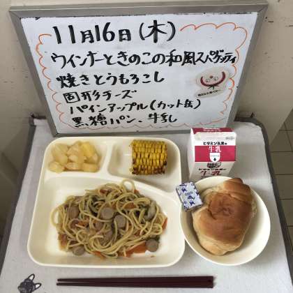 今日の給食の献立は、『ウインナーときのこの和風スパゲッティ、焼きとうもろこし、固形チーズ、パインアップル(カット缶)、黒糖パン1/2