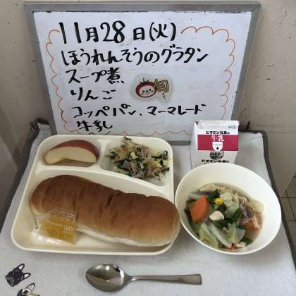 今日の給食の献立は、『ほうれんそうのグラタン、スープ煮、りんご、コッペパン、マーマレード、牛乳』でした。