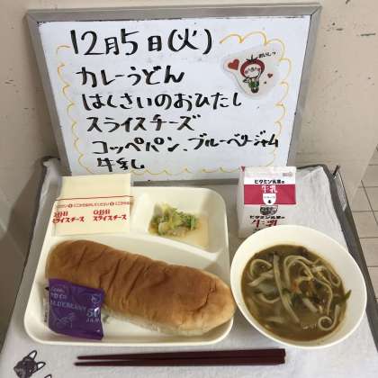 今日の給食の献立は、『カレーうどん、はくさいのおひたし、スライスチーズ、コッペパン、ブルーベリージャム、牛乳』でした。