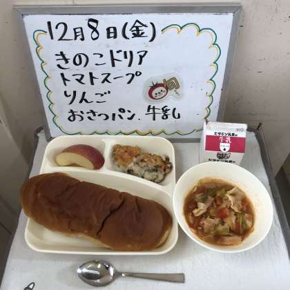 今日の給食の献立は、『きのこドリア、トマトスープ、りんご、おさつパン、牛乳』でした。