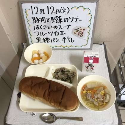 今日の給食の献立は、『豚肉と野菜のソテー、はくさいのスープ、フルーツ白玉、黒糖パン、牛乳』でした。