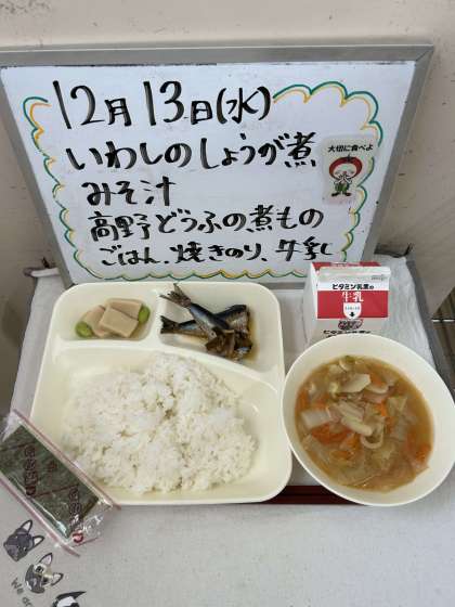 今日の給食の献立は、『いわしのしょうが煮、みそ汁、高野どうふの煮もの、ごはん、焼きのり、牛乳』でした。