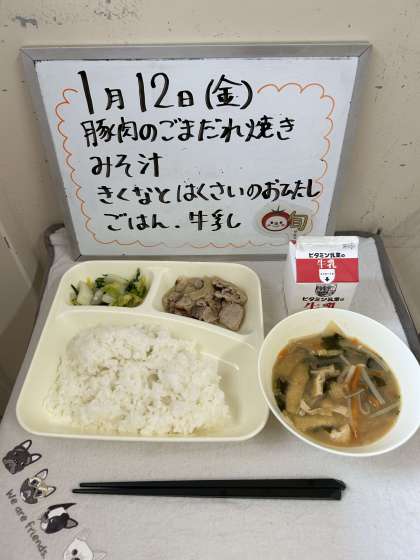 今日の給食の献立は、『豚肉のごまだれ焼き、みそ汁、きくなとはくさいのおひたし、ごはん、牛乳』でした。