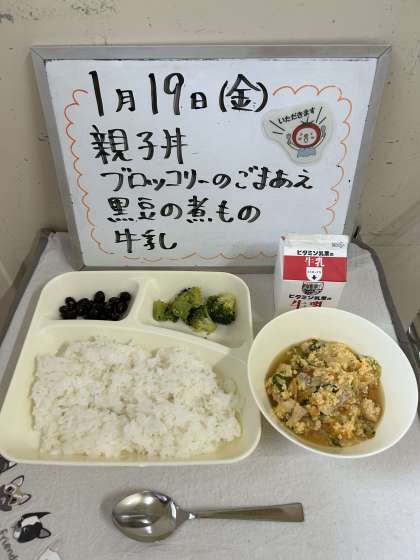 今日の給食の献立は、『親子丼、ブロッコリーのごまあえ、黒豆の煮もの、牛乳』でした。