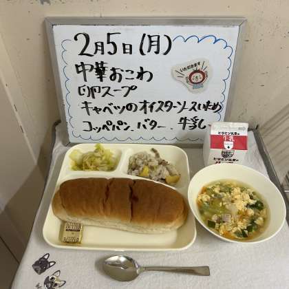 今日の給食の献立は、『中華おこわ、卵スープ、キャベツのオイスターソースいため、コッペパン、バター、牛乳』でした。