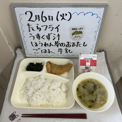 今日の給食の献立は、『たらフライ、うすくず汁、ほうれん草のおひたし、ごはん、牛乳』でした。