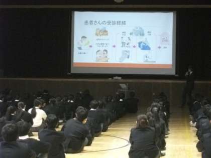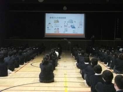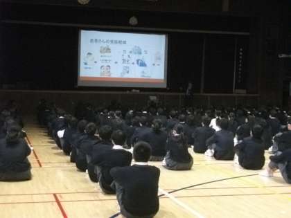 本日、6限目に2年生は体育館で病院の外科医の先生をお迎えして、「みんなで学ぼう令和時代のがん診療」と題して講演をしていただきました。