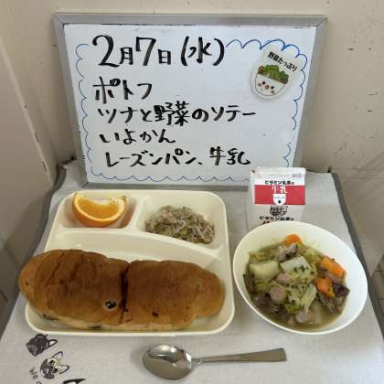 今日の給食の献立は、『ポトフ、ツナと野菜のソテー、いよかん、レーズンパン、牛乳』でした。