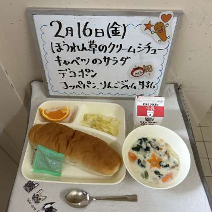 今日の給食の献立は、『ほうれん草のクリームシチュー、キャベツのサラダ、デコポン、コッペパン、りんごジャム、牛乳』でした。